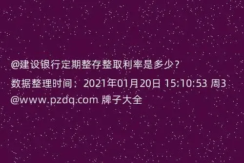 中国建设银行成立于1954年10月1日,是股份制商业银行,是国有五大商业银行之一。整存整取定期存款,是指约定存期,整笔存入,到期一次支取本息的一种储蓄。整存整取的利率分为三个月、半年和一年。三个月的利率是2.85%,半年的利率是3.05%,一年的利率是3.25%。