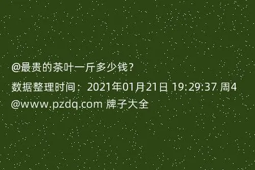 相信喜欢喝茶的朋友们跟喜欢喝酒的朋友是一样的,都是爱物如命的,那么我想知道的是,现在最贵的茶叶一斤多少钱?打算了解一下的,有没有大神可以给我讲解下。
