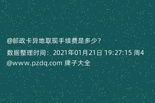 现在的银行卡是可以进行异地取现的,但是我不清楚,取现的手续费是多少钱来着,请问大家,邮政卡异地取现手续费是多少?知道的朋友请解答一下吧,谢谢你们了。